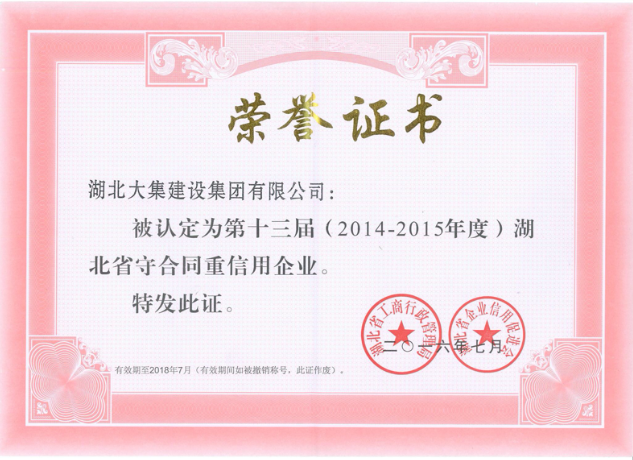 2016年10月17日我們湖北大集建設(shè)集團(tuán)有限公司很榮幸被湖北省工商行政管理局和湖北省企業(yè)信用促進(jìn)會(huì)聯(lián)合評(píng)定為2014—2015年度“守合同重信用企業(yè)”,這也是今年大集地區(qū)唯一一家獲評(píng)企業(yè)。