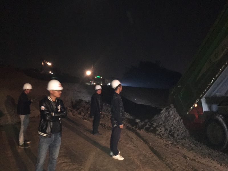 明亮的探照燈刺破黑暗的夜瓊,開(kāi)辟出一片亮色。亮光里,絡(luò)繹不絕的車(chē)輛安靜行進(jìn),相隔不遠(yuǎn)的施工人員有序指揮,裝載,回填,推土、碾壓,所有的工序有條不紊,一條寬闊的路基漸漸成型!