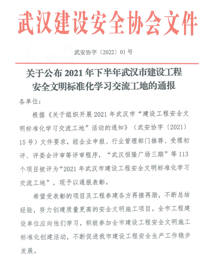 此次獲評(píng)“2021年下半年武漢市建設(shè)工程安全文明標(biāo)準(zhǔn)化學(xué)習(xí)交流工地” 稱號(hào),不僅是對(duì)武漢花博匯十二花坊項(xiàng)目部(二期)安全管理和文明建設(shè)水平的肯定,也有力彰顯了公司企業(yè)形象,希望其他項(xiàng)目能多向做得好的項(xiàng)目學(xué)習(xí),做到高標(biāo)準(zhǔn),嚴(yán)要求,做品牌項(xiàng)目,打造公司口碑,將項(xiàng)目做成標(biāo)準(zhǔn)示范工程!