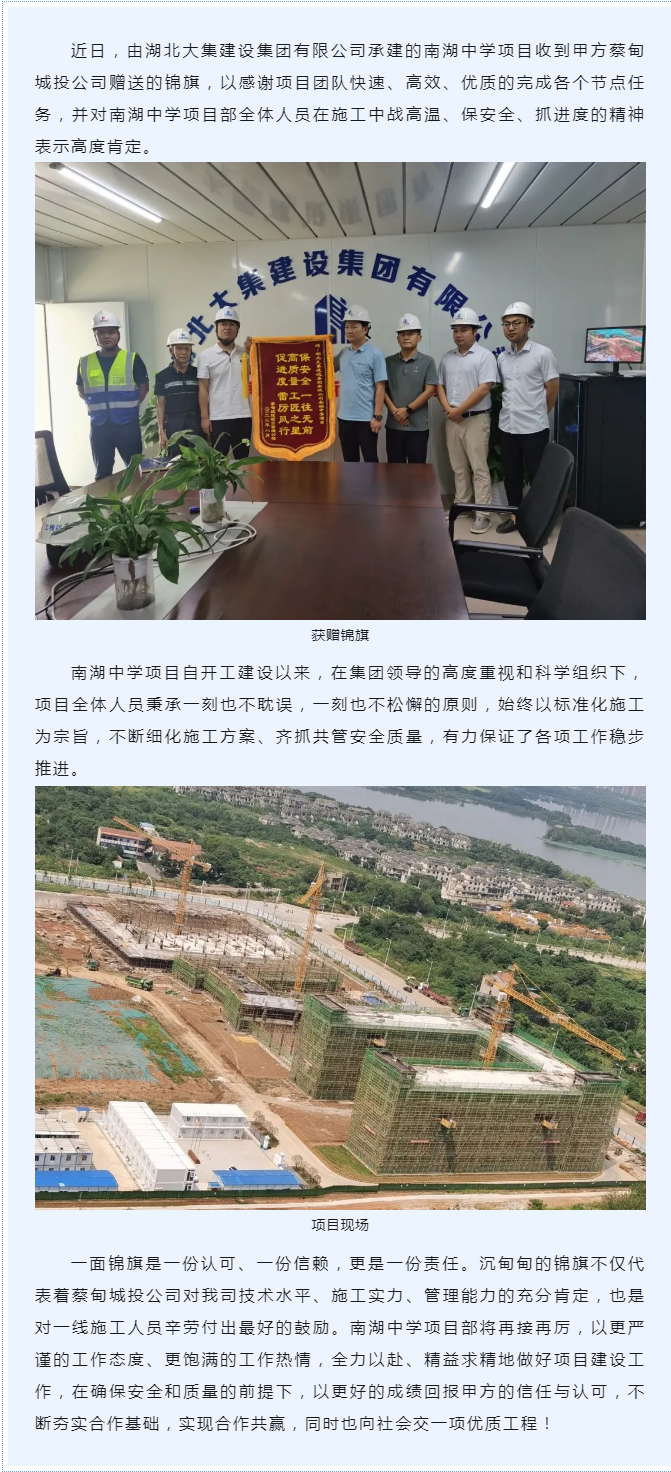 精心施工贏贊譽(yù),甲方單位送錦旗|南湖中學(xué)項(xiàng)目獲贈(zèng)錦旗