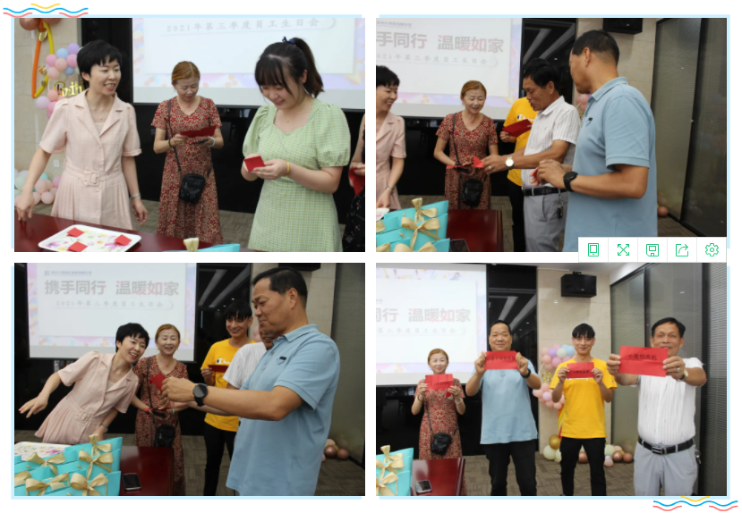 九月,秋高氣爽,碩果累累,秋日的微風和陽光是如此的美好。成長不期而遇,生日如約而至。在精心布置的會議室里,輕快的音樂聲相隨,大屏幕上播放著美好的生日祝福,集團公司為第三季度生日的員工舉辦了小小的生日Party。氣球、生日蛋糕、禮物、精致月餅、琳瑯滿目的零食飲品,每一處溫馨的細節(jié),都承載著公司對員工的愛與關懷。