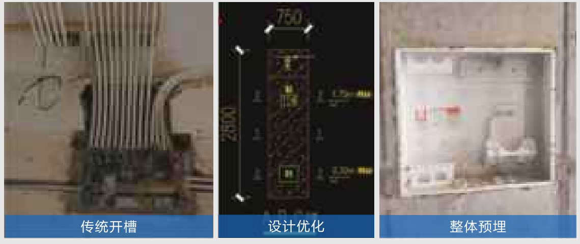 強弱電箱原圖紙在砌體上開槽后埋線盒子,再進行用砂漿修補,這樣在工人施工過程中容易鑿斷或者震裂砌墻,后期修補因砂漿過厚也會引起面層開裂。為確保質(zhì)量,經(jīng)過設(shè)計優(yōu)化,增加構(gòu)造柱預(yù)埋線管及電箱,這樣不但解決開裂問題,加快了施工進度,大大消除了質(zhì)量風(fēng)險。
