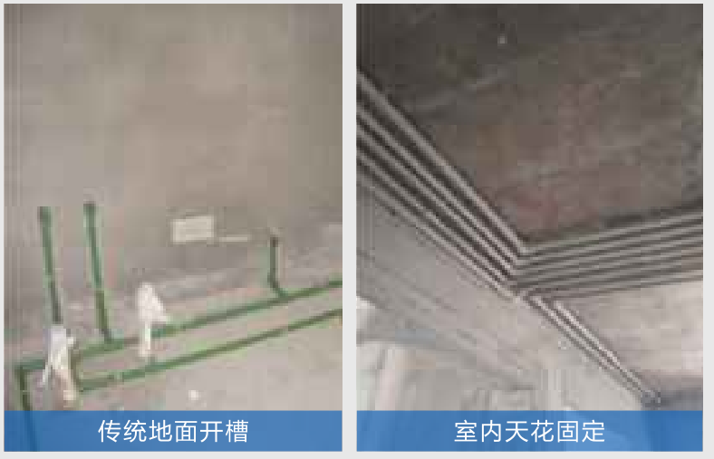 戶內(nèi)水管安裝按照以往的做法會在建筑找平層開槽再進行預(yù)埋,裝修完成后如遇到滲漏水很難進行維修。為實現(xiàn)無后顧之憂,全部設(shè)置在天花,公共部位進行吊頂掩蓋,戶內(nèi)走梁交接陰角,用木盒子裝修掩蓋,這樣不但解后期維修問題,樓板地面不再開槽,大大減少建筑找平厚度,使戶內(nèi)凈高空間增大。