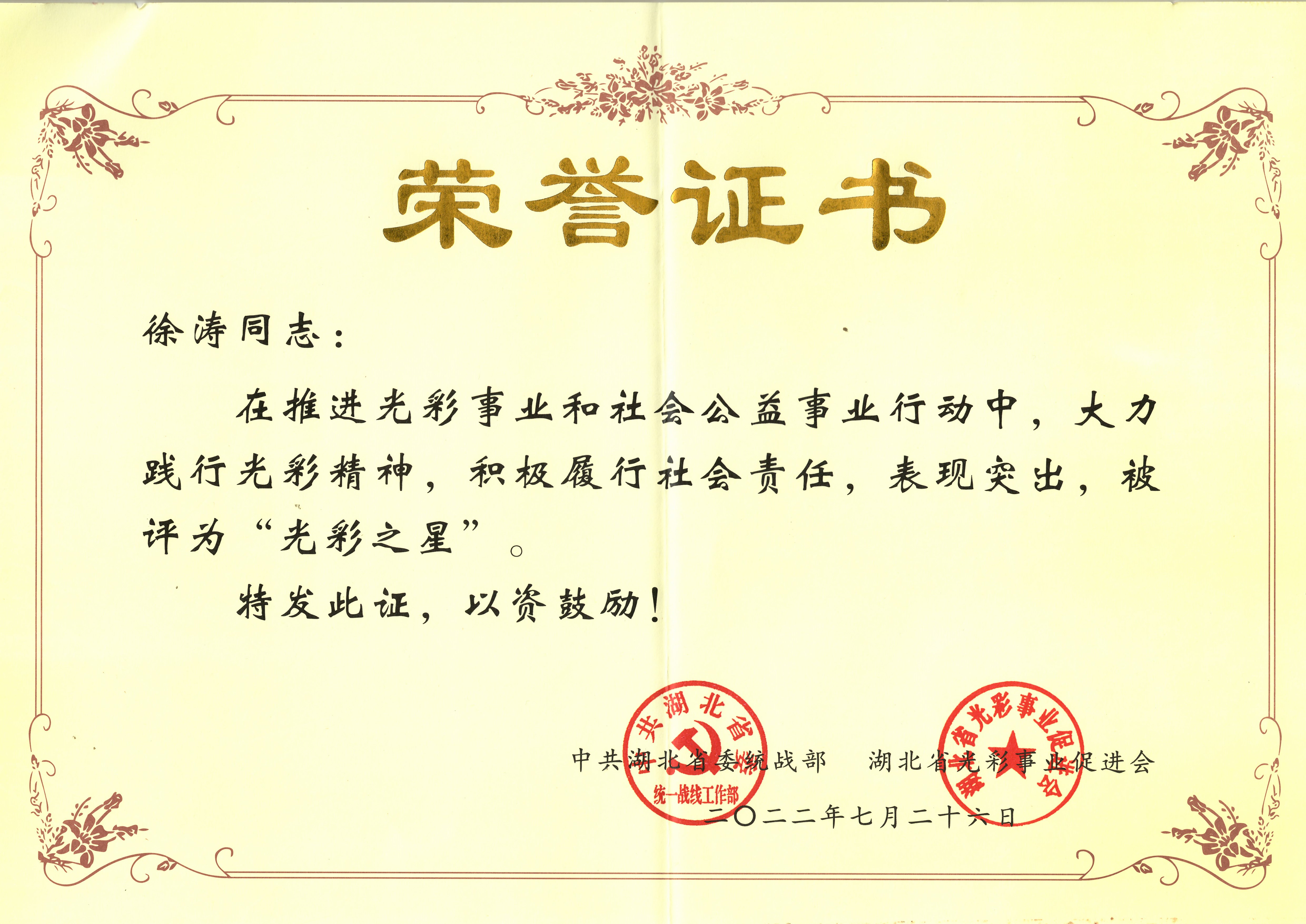 近日,由中共湖北省委統(tǒng)戰(zhàn)部、省光彩事業(yè)促進會共同評選60名民營經(jīng)濟人士“光彩之星”表彰會在恩施召開。會議表彰了一批熱心公益事業(yè)、積極回報社會的優(yōu)秀非公有制經(jīng)濟人士,湖北大集建設集團有限公司董事長、武漢閱景匯投資發(fā)展有限公司董事長徐濤榮獲全省“光彩之星”榮譽稱號!